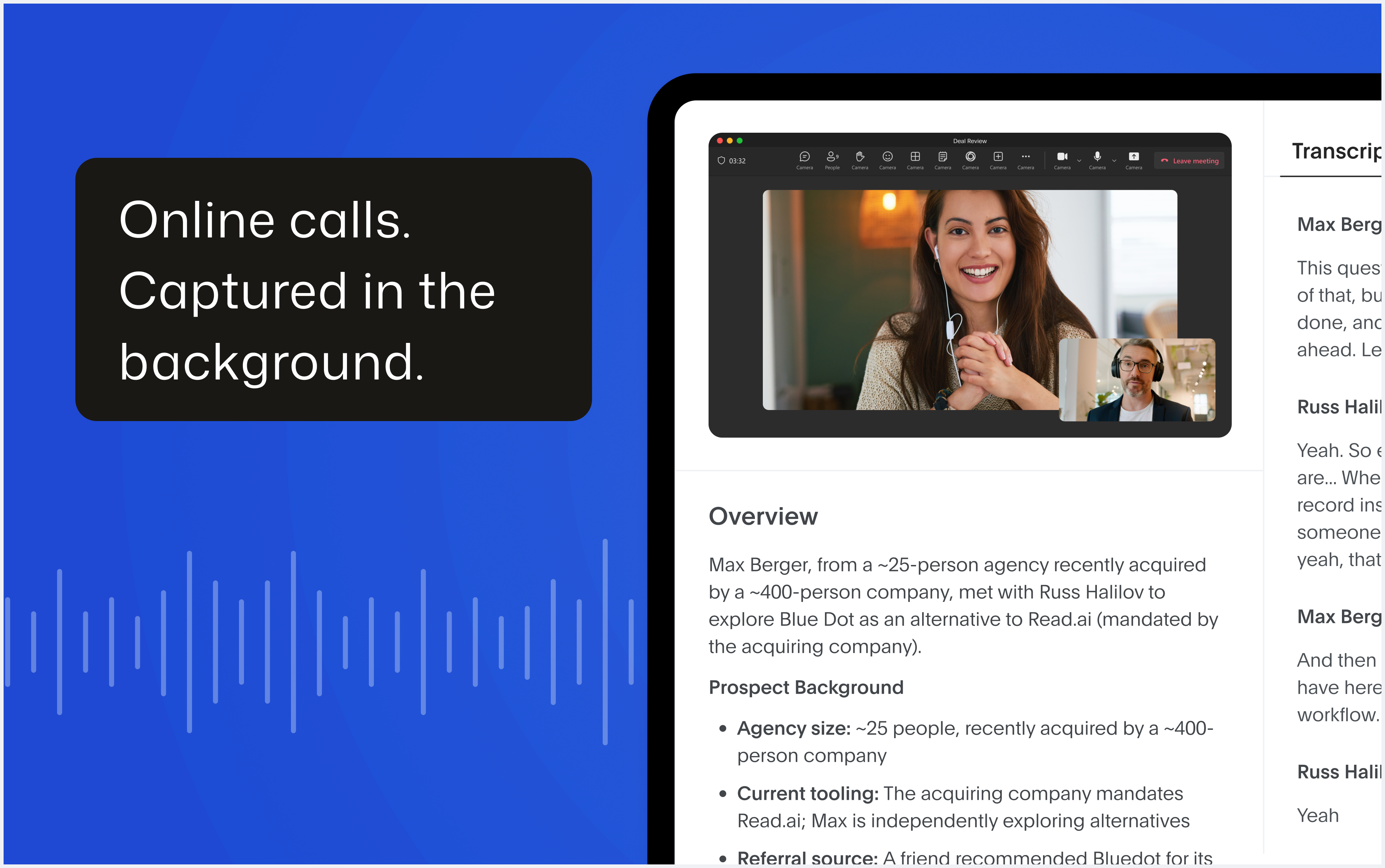 Bluedot captures, transcribes, and summarises every meeting, online or in-person. Works on any platform and auto-updates your CRM, Notion and more.