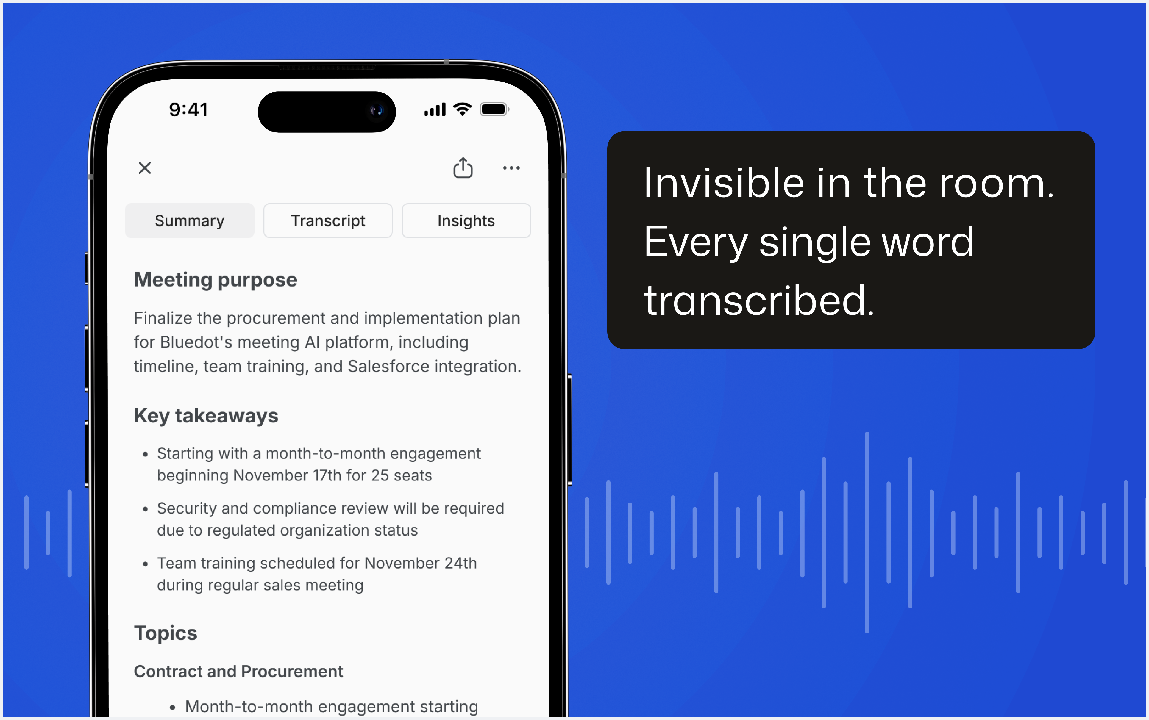 Absolutely. You can use the Bluedot mobile app on iOS or Android to record and transcribe face-to-face interviews, client meetings, or team huddles. The AI will generate the same high-quality summaries and action items as it does for online calls.